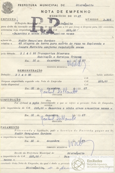RECEBI DA PREFEITURA MUNICIPAL DE DIVINÓPOLIS A IMPORTÂNCIA DE CR$ 225,00 (DUZENTOS E VINTE CINCO CRUZEIROS NOVOS) CONSTANTE DESTA NOTA DE EMPENHO, DA QUAL É DADA A PRESENTE QUITAÇÃO EM TRIPLICATA.