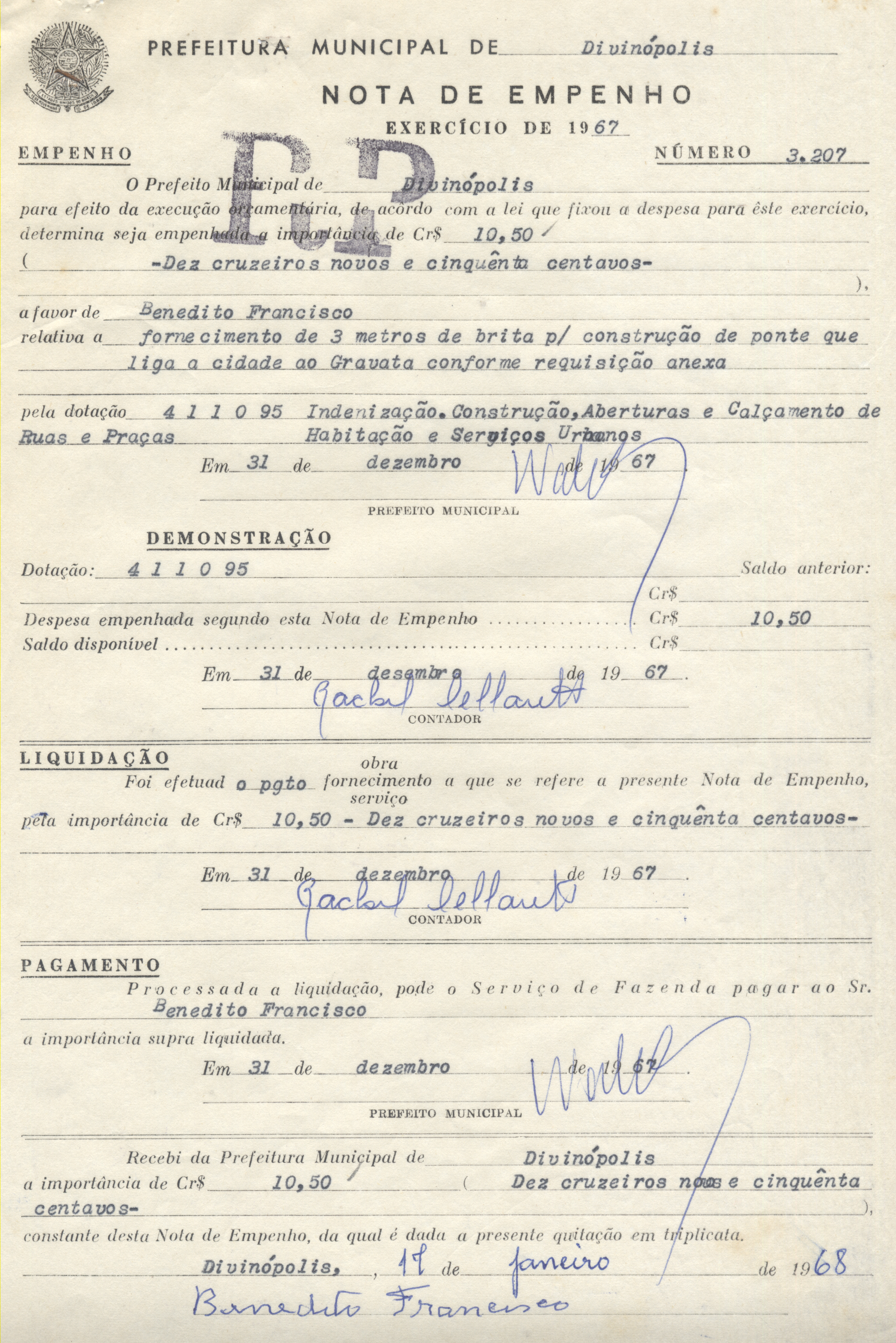 RECEBI DA PREFEITURA MUNICIPAL DE DIVINÓPOLIS A IMPORTÂNCIA DE CR$ 10,50 (DEZ CRUZEIROS NOVOS E CINQUENTA CENTAVOS) CONSTANTE DESTA NOTA DE EMPENHO, DA QUAL É DADA A PRESENTE QUITAÇÃO EM TRIPLICATA.