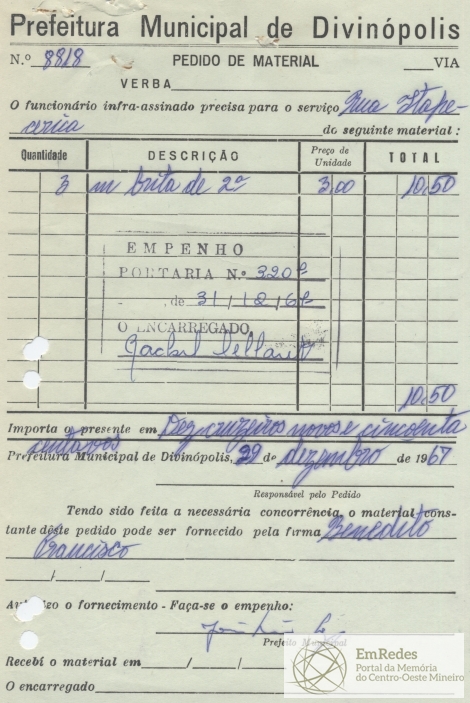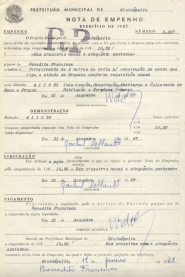 RECEBI DA PREFEITURA MUNICIPAL DE DIVINÓPOLIS A IMPORTÂNCIA DE CR$ 10,50 (DEZ CRUZEIROS NOVOS E CINQUENTA CENTAVOS) CONSTANTE DESTA NOTA DE EMPENHO, DA QUAL É DADA A PRESENTE QUITAÇÃO EM TRIPLICATA.