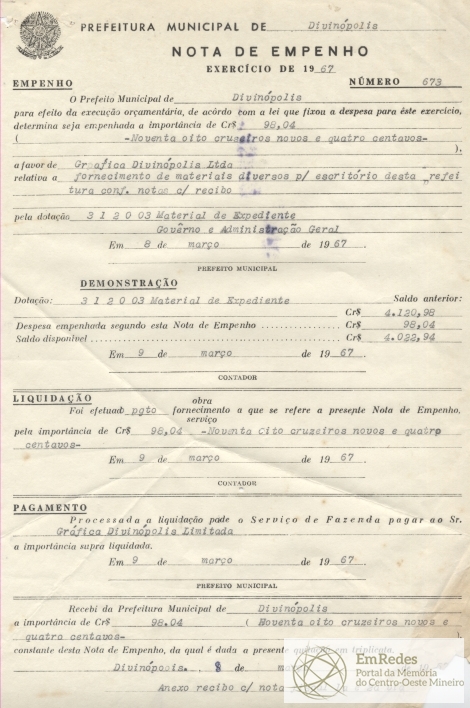RECEBI DA PREFEITURA MUNICIPAL DE DIVINÓPOLIS A IMPORTÂNCIA DE CR$98,04 (NOVENTA E OITO CRUZEIROS E QUATRO CENTAVOS) CONSTANTE DESTA NOTA DE EMPENHO, DA QUAL É DADA A PRESENTE QUITAÇÃO EM TRIPLICATA.
