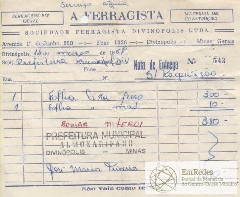 A FAVOR DE FERRAGISTA DIVINÓPOLIS LTDA., RELATIVA A FORNECIMENTO DE DIVERSOS P/ CONSERVAÇÃO DE TRATAMENTO DIGO DA ESTAÇÃO DE TRATAMENTO CONF. NOTA FISCAL ORDEM 1634, PELA DOTAÇÃO 312092 PARA SERVIÇOS DE ÁGUA E ESGÔTO/HABITAÇÃO E SERVIÇOS URBANOS EM 24 DE MAIO DE 1967.