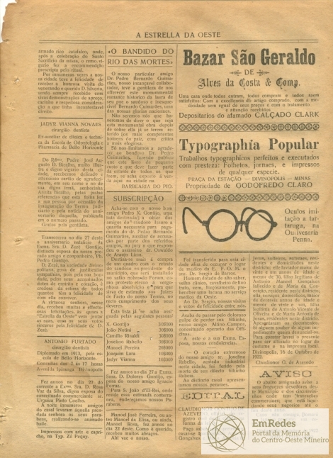 Jornal - A Estrella do Oeste - A Estrella d Oeste - A Estrella da Oeste - Características de Divinópolis - Grandeza de Divinópolis - Nota de Falecimento - Dona Amelia Peixoto Soares de Moura - Evolução do Casamento - Recordações - Termo Judiciário de Divinópolis - Pedro Guimarães - Deputado Estadual - Dom Silvério - Comemorações - Livro “O bandido do Rio das Mortes” - Arrecadação de Fundos - Casamentos - Aviso de cobrança - Publicidade - Eleitorado - Nomeações.