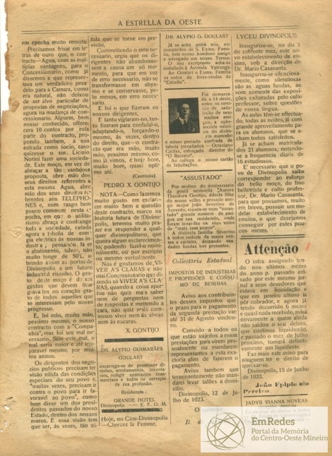 Jornal - A Estrella do Oeste - A Estrella da Oeste - Estrella D Oeste - Educação - Teatro - Contrato de Abastecimento - Luz - Água - Telefone - Indústrias - Atraso - Impostos - Lyceu Divinópolis - Ensino médio - Mario Csasanta - Publicidades
