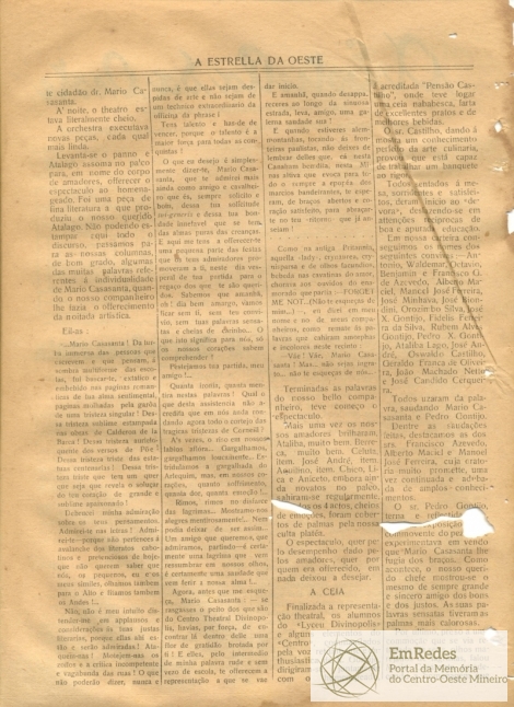 Jornal - A Estrella do Oeste - A Estrella d Oeste - A Estrella da Oeste - Ciência - Vida Latente - Química - Biologia - Fisiologia - Mario Casasanta - Homenagem - Espetáculo - Teatro - Social - Arruaceiros - Visitas - Falecimentos - Publicidades.