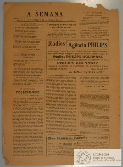 A Semana, 09 de Novembro de 1947,n° 66. A página de jornal contêm: um poema, aniversariantes, Publicidades,cinema e teatro.
