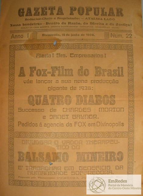 Página do Jornal Gazeta Popular, que tinha como dono e redator chefe Ataliba Lago, a página contém propaganda e anunciado de novo filme da Fox Film do Brasil, Quatro Diabos, ANNO I, 16 de Junho 1929,n° 22.