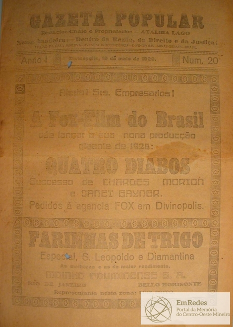 Página do Jornal Gazeta Popular, que tinha como dono e redator chefe Ataliba Lago, a página contém propaganda e anunciado de novo filme da Fox Film do Brasil, Quatro Diabos. ANNO I, 19 de Maio 1929,n° 20.