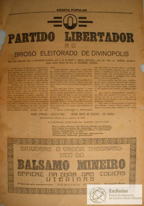 Página do jornal Gazeta Popular, fala sobre uma convocação do Partido Libertador, ANNO I, 22 de Setembro 1929,n° 28.