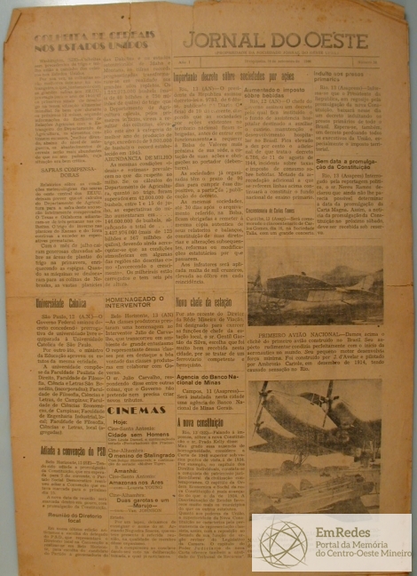 Jornal do Oeste, contém reportagens, informações, artigos gerais, propagandas, notícias nacionais e internacionais - * Primeira página: "colheita de cereais nos Estados Unidos" - "importante decreto sobre sociedades por ações" - "a nova constituição" - página 3: "nova diretoria do P.S.D de Pará de Minas" [PSD: partido social democrático].