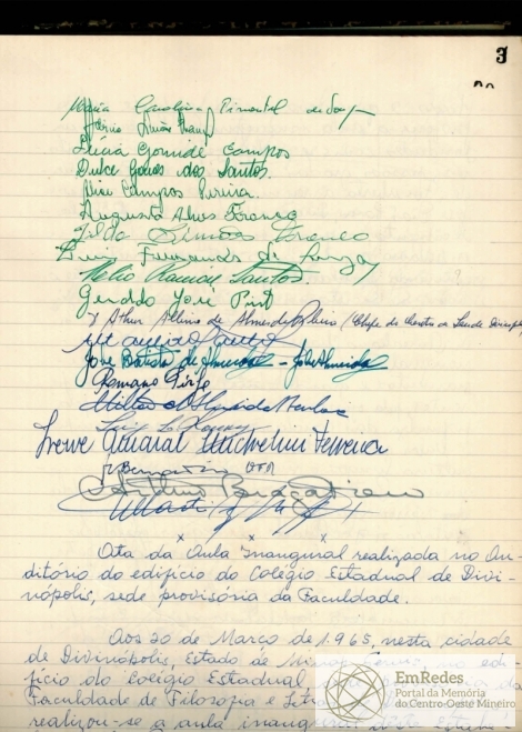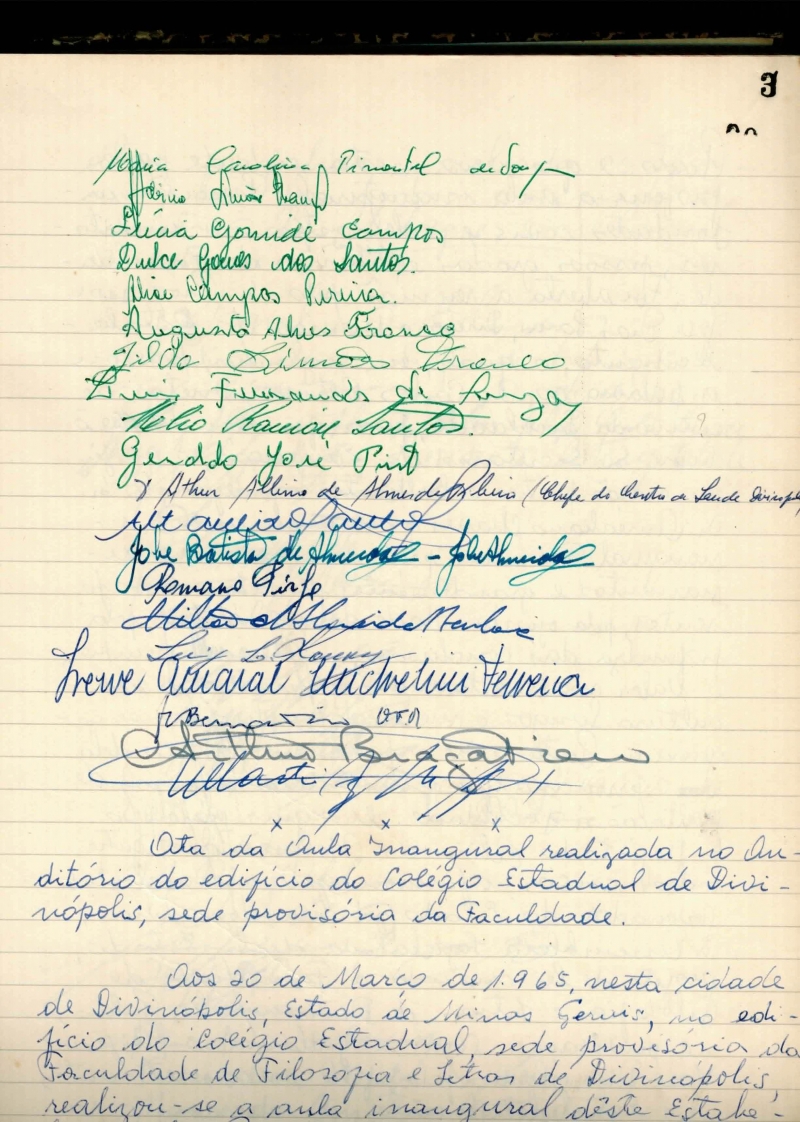Reuniram-se na sede do colégio estadual, no dia 25 de outubro de 1964, membros da assembléia fundadora da Faculdade de Filosofia e Letras de Divinópolis.