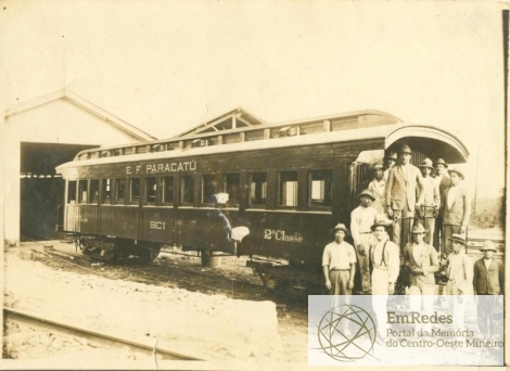 Na imagem, vê-se homens não identificados, à frente do vagão E F Paracatu – BC1 – 2ª Classe. No verso, lê-se a seguinte descrição: Bom Despacho, 1930. Geraldo Magela Costa.