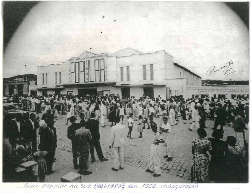 Aglomeração de pessoas em frente ao Cine Popular, no dia de sua inauguração. Abaixo da foto, lê-se: Cine popular na sua inauguração em 1950. Inauguração.