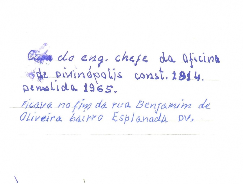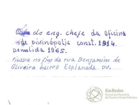 Casa do engenheiro chefe da oficina da RMV – Rede Mineira de Viação. Construída em 1914 e demolida em 1965. Segundo informações do verso da imagem, a casa ficava situada na Rua Benjamim de Oliveira, no Bairro Esplanada em Divinópolis.