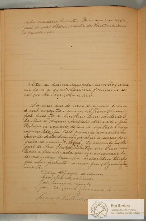 AOS CINCO DIAS DO MÊS DE JANEIRO DE 1913, NO PAÇO MUNICIPAL, FOI ABERTA A SESSÃO, ONDE O PRESIDENTE ANUNCIOU QUE IA SE PROCEDER A ELEIÇÃO DOS MEMBROS EFETIVOS E SUPLENTES QUE TEM DE FAZER PARTE DA COMISSÃO DE REVISÃO DE ALISTAMENTO, FORAM DECLARADOS MEMBROS EFETIVOS OS SENHORES: JOÃO SEVERINO DE AZEVEDO, IZAURO FERREIRA DA SILVA E JOSÉ NOGUEIRA GUIMARÃES E SUPLENTES: ARNALDO AUGUSTO DE AVELAR, ANTONIO MACHADO E FRANCISCO MACHADO FILHO.