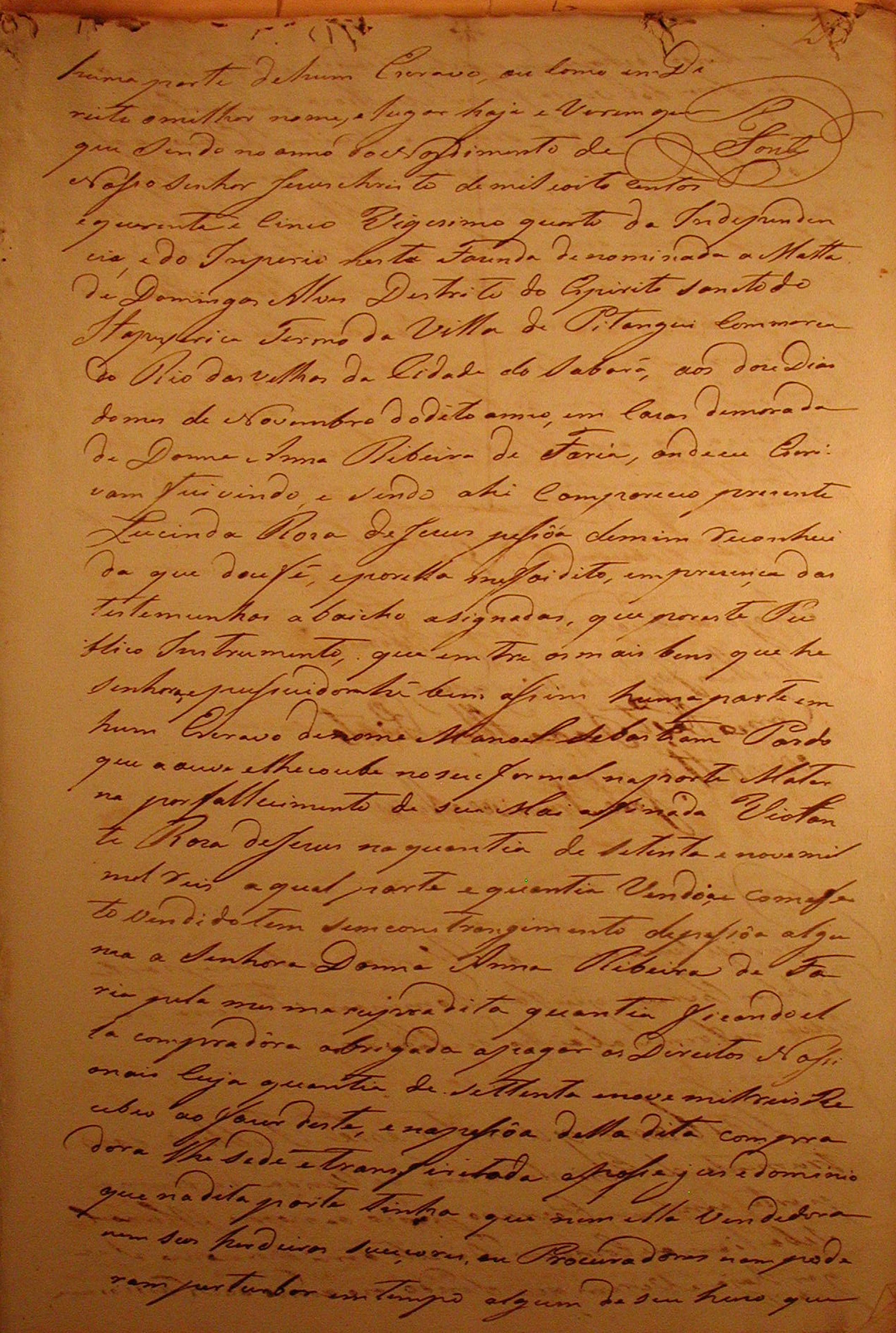 ESCRITURA DE VENDA , QUE FAZ LUCINDA ROSA DE JESUS A SENHORA ANNA RIBEIRO DE FARIA, DE UMA PARTE EM UM ESCRAVO DE NOME MANOEL SEBASTIAM (SIC) PARDO, QUE AS OUVE E LHE COUBE POR FALLECIMENTO (SIC) DE SUA MAE, PELA QUANTIA DE SETENTA E NOVE MIL RÉIS(SIC).