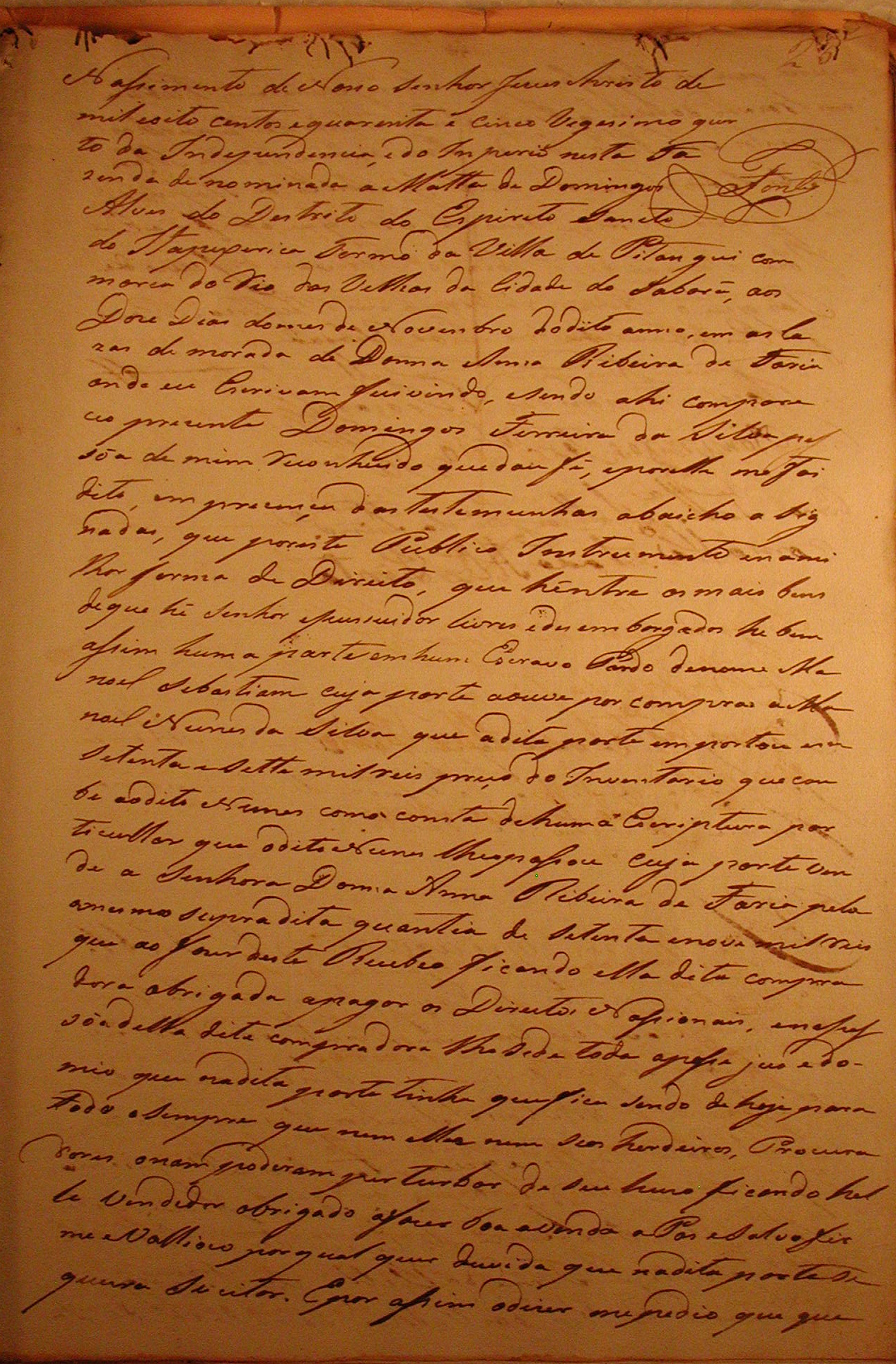 ESCRIVÃO: JOSÉ FERNANDES ROZADO LOCAL: FAZENDA DENOMINADA A MATA DE DOMINGOS ALVES DO DISTRITO DO ESPÍRITO SANTO DO ITAPECERICA, TERMO DA VILLA DE PITANGUI, COMMARCA DO RIO DAS VELHAS DA CIDADE DO SABARÁ(SIC). ESCRITURA DE VENDA , QUE FAZ DOMINGOS FERREIRA DA SILVA A ANNA RIBEIRO DE FARIA, DE UMA PARTE EM UM ESCRAVO DE NOME MANOEL SEBASTIAM (SIC), PELA QUANTIA DE SETENTA E NOVE MIL RÉIS(SIC).