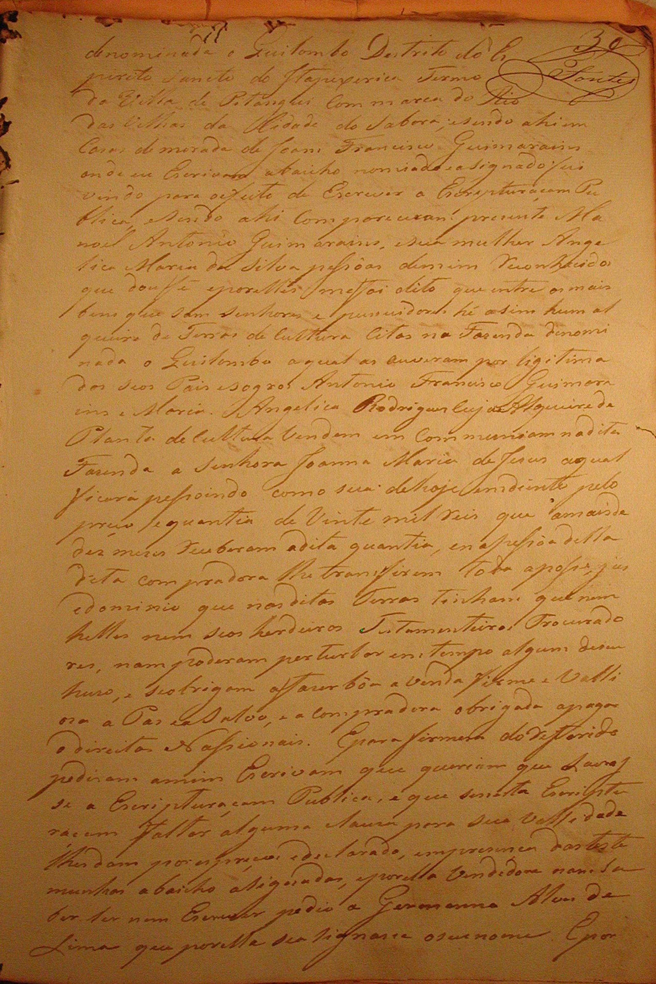 ESCRITURA DE VENDA, QUE FAZ MANOEL ANTÔNIO GUIMARAINS (SIC) A JOANNA MARIA DE JESUS, DE UM ALQUEIRE DE TERRAS DE CULTURA CITA NA FAZENDA DENOMINADA O QUILOMBO A QUAL OUVERAM POR LEGÍTIMA DOS SEUS PAIS E SOGRO ANTÔNIO FRANCISCO GUIMARAINS E ANGELICA RODRIGUES, PELO PREÇO E QUANTIA DE VINTE MIL RÉIS(SIC).