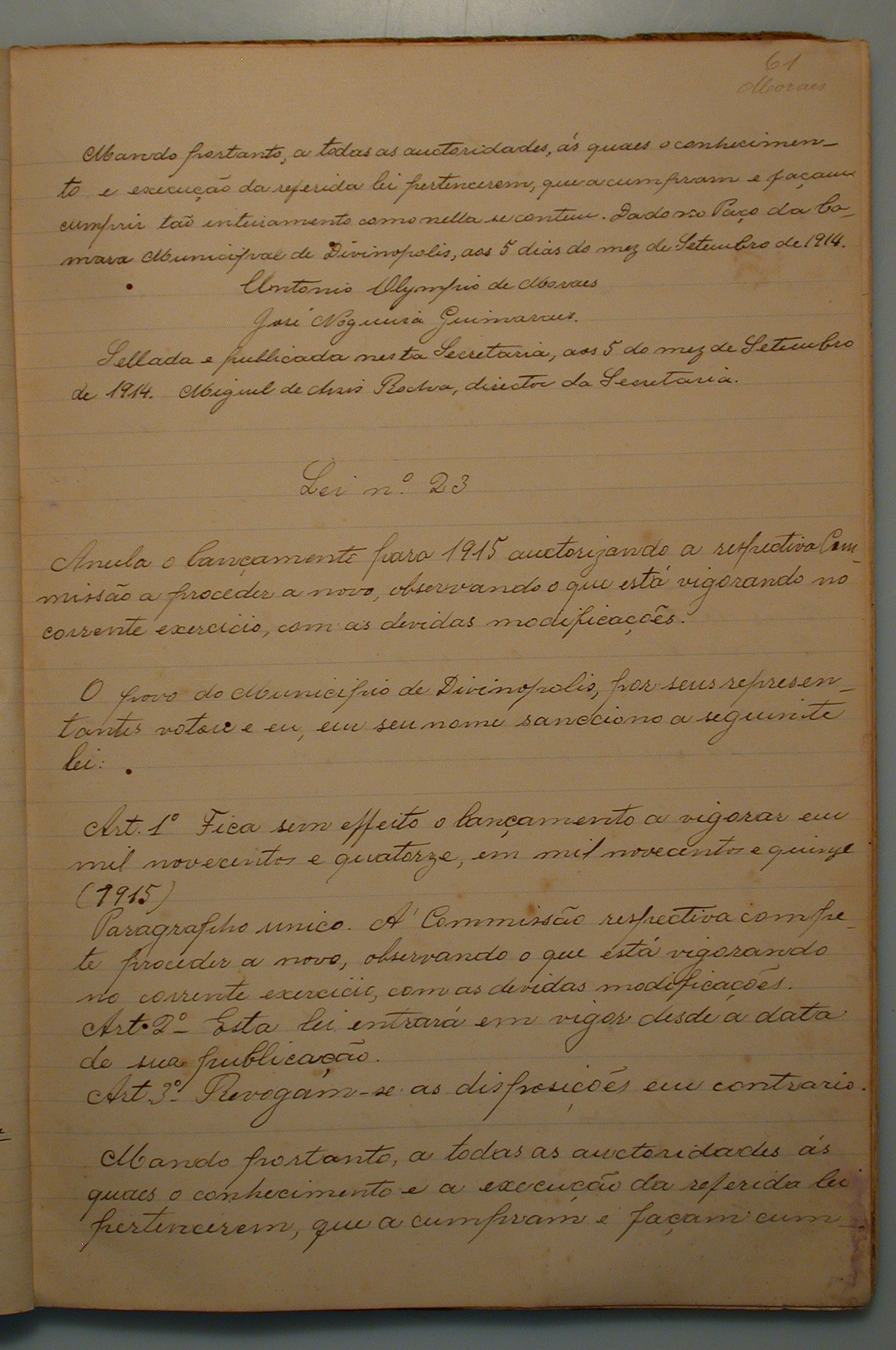 ANULA O LANÇAMENTO PARA 1915, AUTORIZANDO A RESPECTIVA COMISSÃO A PROCEDER A NOVO, OBSERVANDO O QUE ESTÁ VIGORANDO NO CORRENTE EXERCÍCIO COM AS DEVIDAS MODIFICAÇÕES.