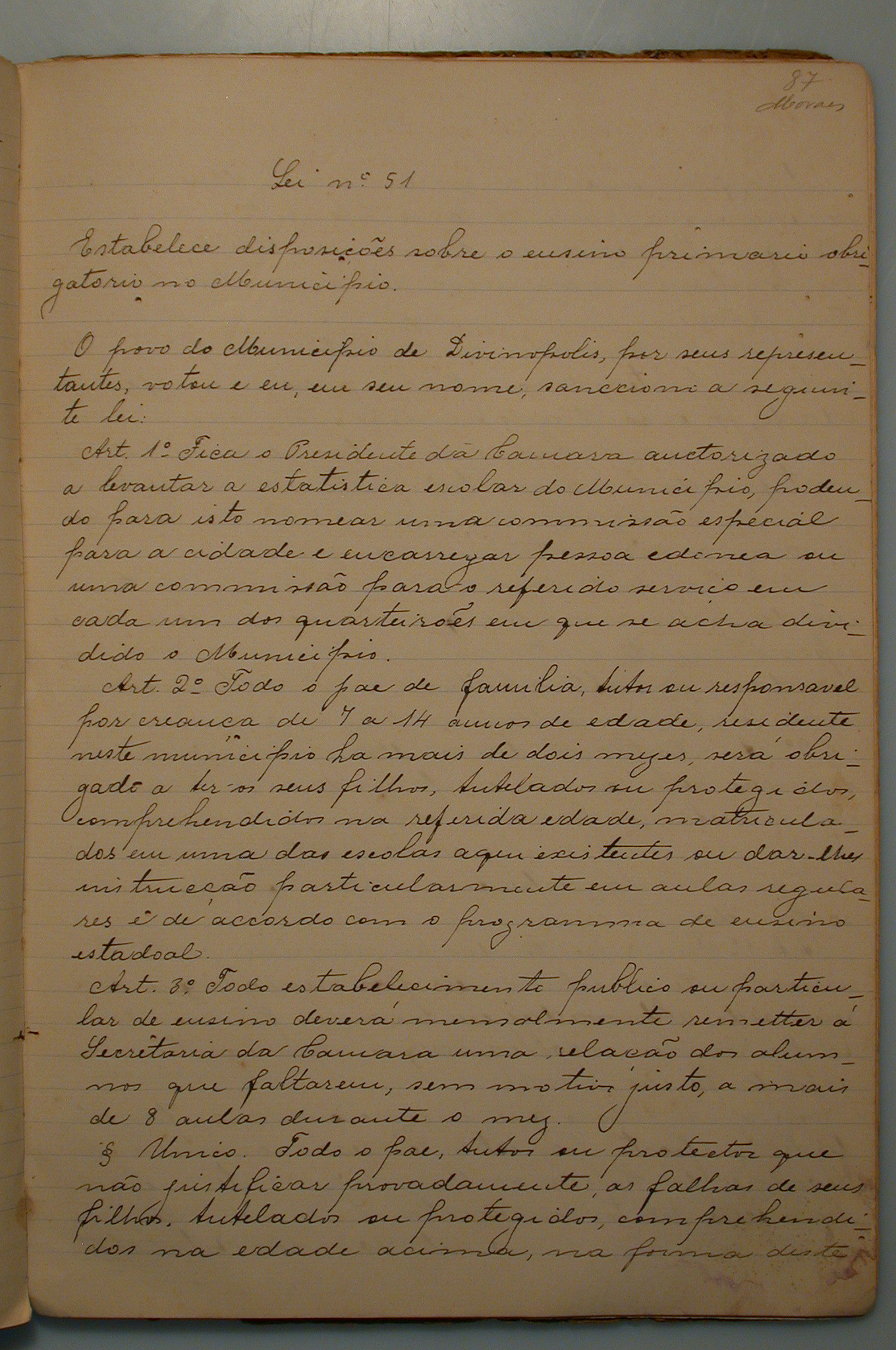 ESTABELECE DISPOSIÇÕES SOBRE O ENSINO PRIMÁRIO OBRIGATÓRIO NO MUNICIPIO.