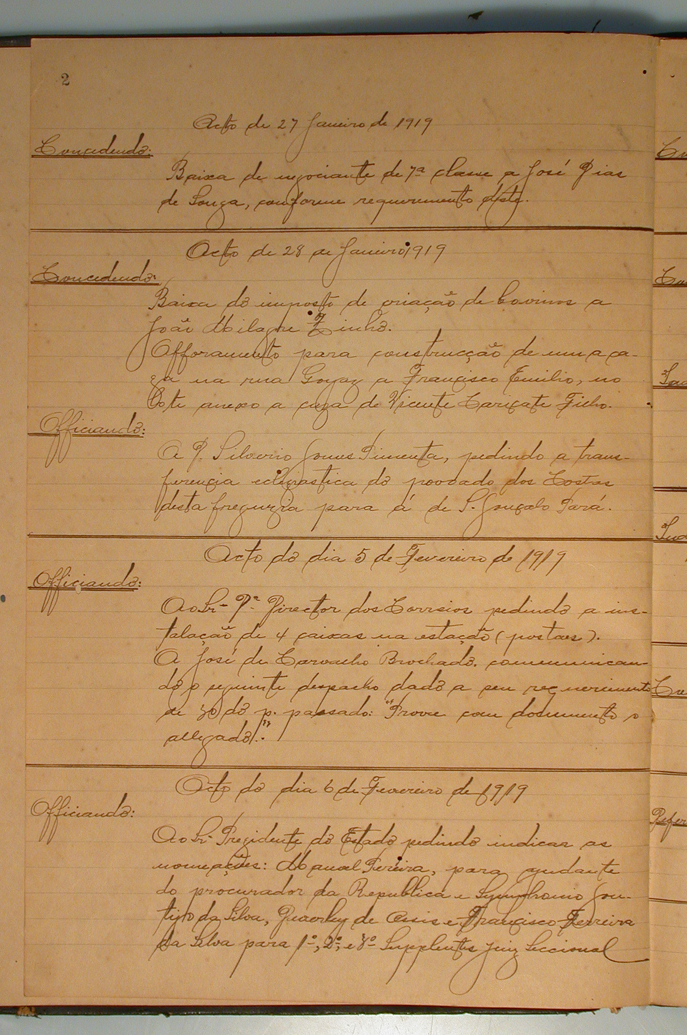 CONCEDE: BAIXA DO IMPOSTO DE CRIAÇÃO DE BOVINOS A JOÃO MILAGRE ZINHO. AFORAMENTO PARA CONSTRUÇÃO DE UMA CASA NA RUA GOIÁS A FRANCISCO EMÍLIO, NO LOTE ANEXO A CASA DE VICENTE CARICATE FILHO.
