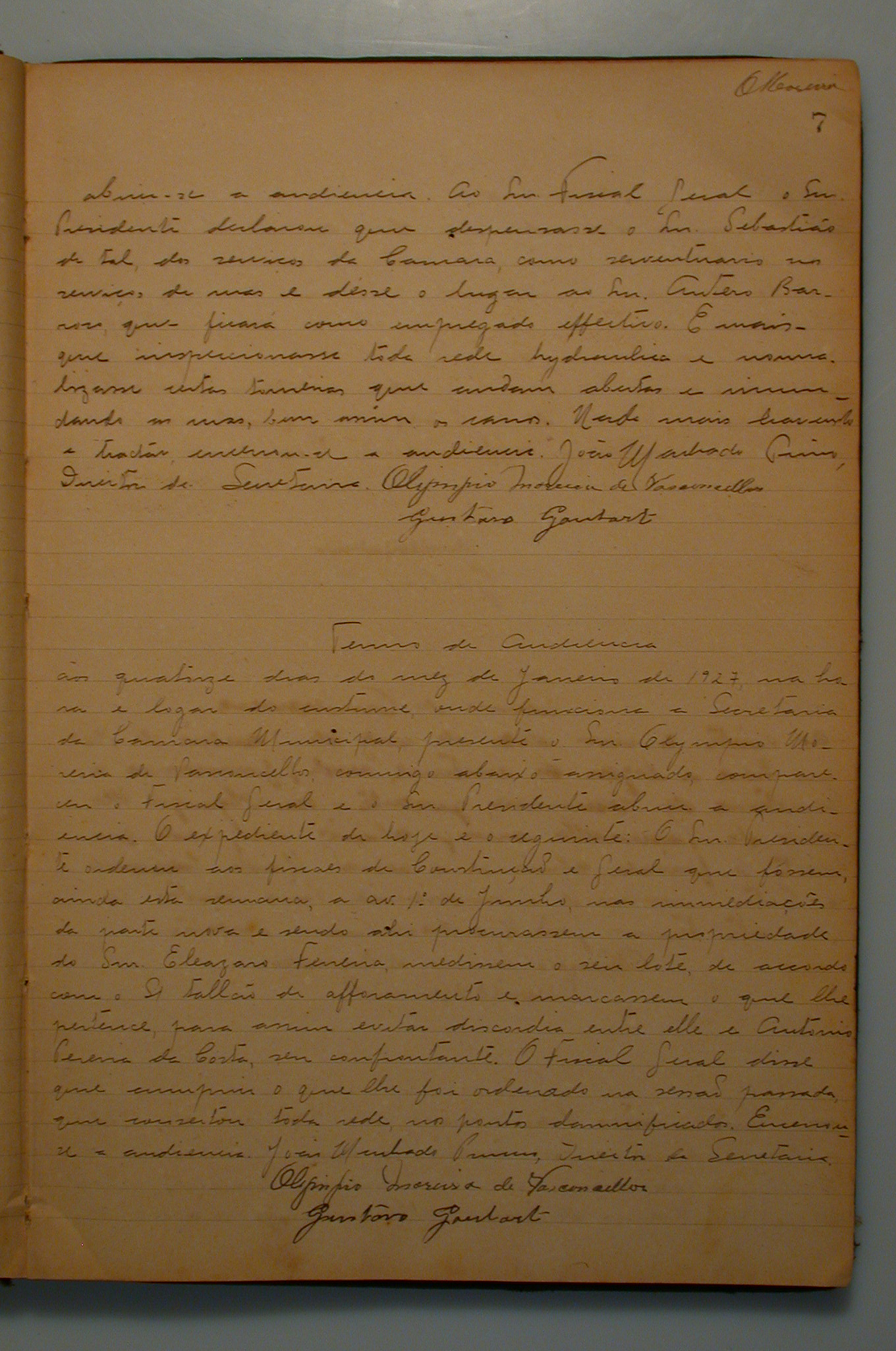 TERMO DE AUDIÊNCIA: COMPARECEU O FISCAL GERAL, GUSTAVO GOULART. O SENHOR PRESIDENTE DECLAROU QUE DISPENSASSE O SR. SEBASTIÃO DE TAL, DOS SERVIÇOS DA CÂMARA, E DESSE O LUGAR AO SR. ANTERO BARROSO, QUE FICARÁ COMO EFETIVO, E QUE FOSSEM INSPECIONADAS TODA A REDE HIDRÁULICA, BEM COMO OS CANOS, PARA QUE SE EVITE TORNEIRAS QUE INUNDAM A CIDADE. NADA MAIS HAVENDO A TRATAR, FOI ENCERRADA A SESSÃO.