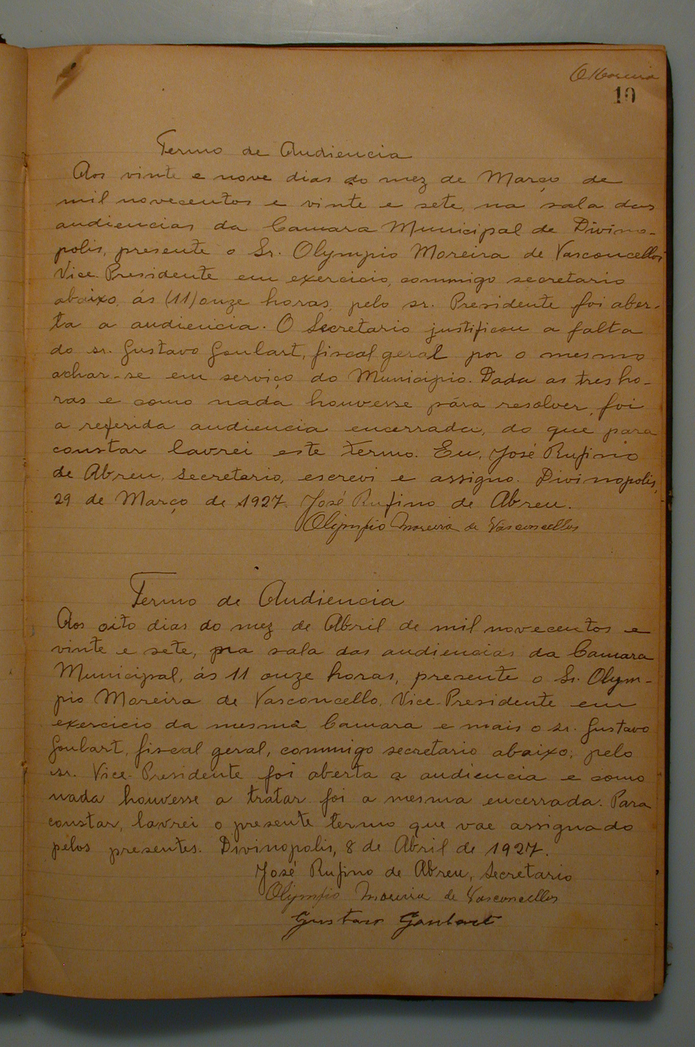 TERMO DE AUDIÊNCIA: COMPARECERAM O VICE- PRESIDENTE OLYMPIO MOREIRA DE VASCONCELLOS. O SECRETÁRIO JUSTIFICOU A FALTA DO SR. GUSTAVO GOULART, FISCAL GERAL, POR O MESMO ACHAR-SE EM SERVIÇO DO MUNICIPIO, NADA HOUVESSE PARA RESOLVER FOI ENCERRADA A AUDIÊNCIA.