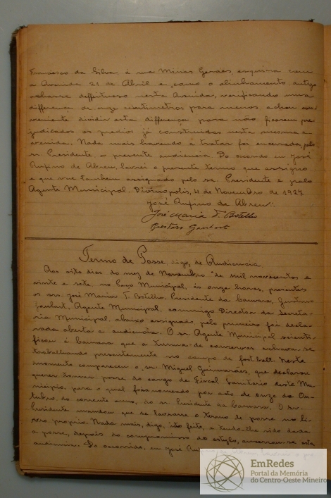 TERMO DE AUDIÊNCIA: COMPARECERAM JOSÉ MARIA TEIXEIRA BOTELHO, PRESIDENTE DA CÂMARA E GUSTAVO GOULART AGENTE MUNICIPAL, QUE INFORMOU QUE O CANAL QUE CONDUZ ÀGUA AO MATADOURO TINHA SIDO ARROMBADO E UMA PARTE DO MURO DESTE MATADOURO HAVIA CAÍDO, QUE FOI PRONTAMENTE ORDENADO, PELO PRESIDENTE QUE FOSSEM FEITOS OS REPAROS NECESSÁRIOS.O AGENTE MUNICIPAL INFORMOU QUE A TURMA DA CONSERVA DE RUAS ACHAVA-SE TRABALHANDO NO CAMPO DE FOOTBALL E QUE O FREI HILÁRIO IRIA PROCEDER A CONFECÇÃO DA FOSSA EXIGIDA PELA CÂMARA, PARA O ESCOAMENTO DAS ÁGUAS SAÍDAS DO COLÉGIO SERAPHICO.