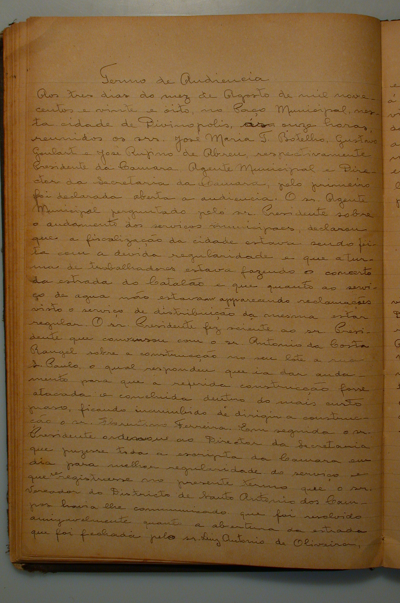 TERMO DE AUDIÊNCIA: COMPARECERAM O SR. JOSÉ MARIA T. BOTELHO, PRESIDENTE DA CÂMARA, E GUSTAVO GOULART, AGENTE MUNICIPAL. O SR. AGENTE ESCLARECEU QUE OS SERVIÇOS MUNICIPAIS DE FISCALIZAÇÃO ESTAVAM SENDO FEITOS COM REGULARIDADE, QUE A TURMA DE TRABALHADORES ESTAVA FAZENDO OS CONSERTOS DA ESTRADA DO CATALÃO, QUE O SERVIÇO DE ÁGUA ESTAVA NA MAIS PERFEITA ORDEM,VISTO QUE NÃO HAVIAM RECLAMAÇÕES. O SR. PRESIDENTE ORDENOU AO DIRETOR DA SECRETARIA QUE COLOCASSE TODA A ESCRITA DA CÂMARA EM DIA, PARA O MELHOR ANDAMENTO DOS SERVIÇOS E QUE SE REGISTRASSE A COMUNICAÇÃO DO VEREADOR DE SANTO ANTÔNIO DOS CAMPOS, QUE A QUESTÃO DA ESTRADA QUE FOI FECHADA PELO SR. LUÍZ ANTONIO DE OLIVEIRA JÁ ESTAVA RESOLVIDA.